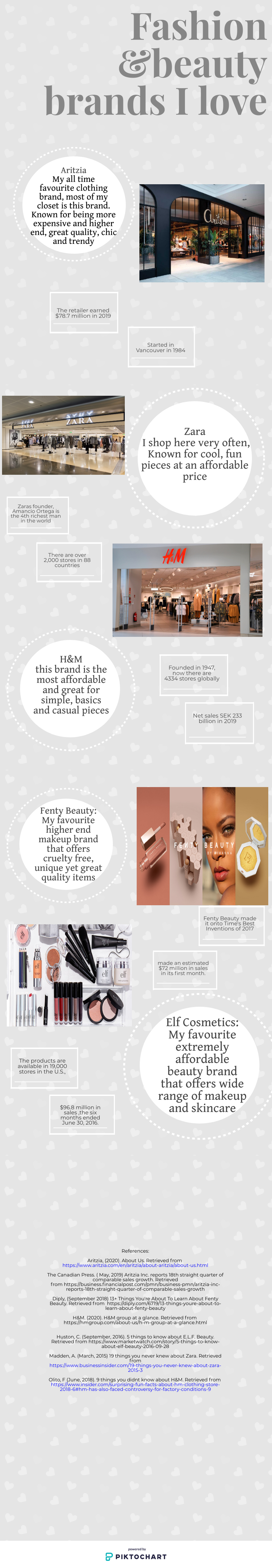 Hello everyone, welcome back to Golden Hunny! This week I will be showcasing an infographic that will be present some interesting facts about the fashion and beauty industry! The graphic will show my top five favourite fashion and beauty brands that I shop at often both in store and online. Some of the businesses are higher end and offer more expensive high-quality items and some very affordable that offer simple basics so you can see both sides of the spectrum in this post! I love using infographics as a way to display an idea through imaginative layouts, colours and pictures and really enjoy how creative you can get when making one so I hope you all enjoy and get inspired to create your own infographic!